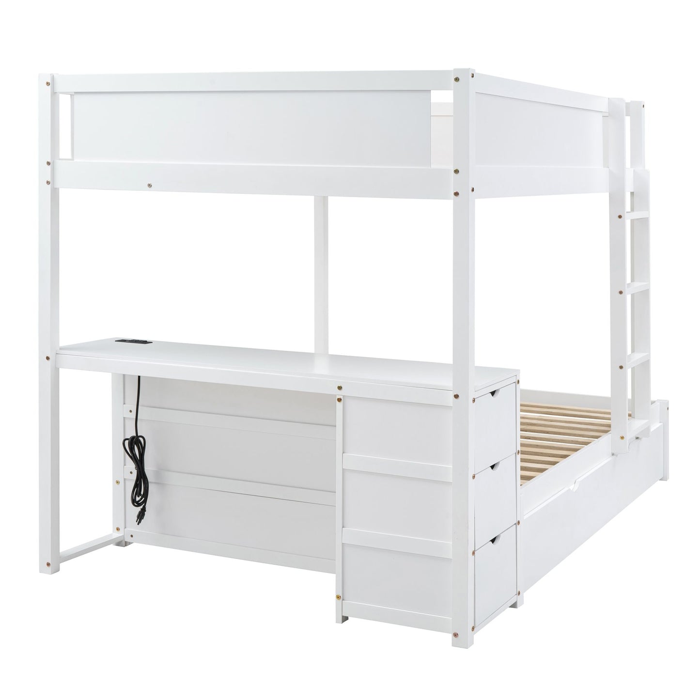 Full-Over-Full Bunk Bed with Twin size Trundle, Storage and Desk, White
