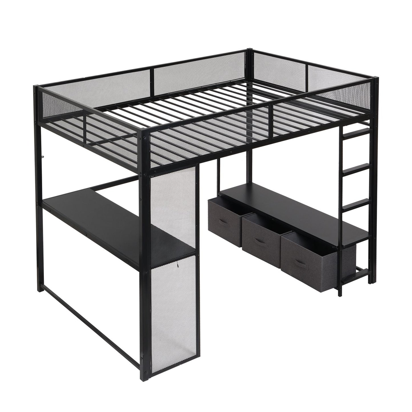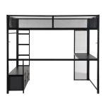 Full Size Metal Gaming Loft Bed with LED, Desk, Open Wardrobe and 3 Linen Storage Drawers, Black