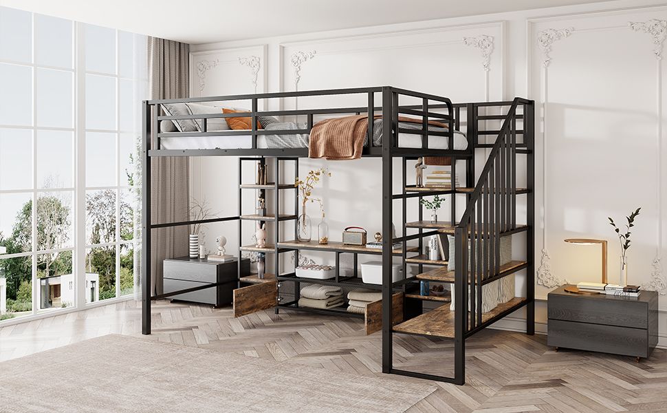 Full Size Metal Loft Bed with Staircase, Low Storage Table and Storage Shelves, Black