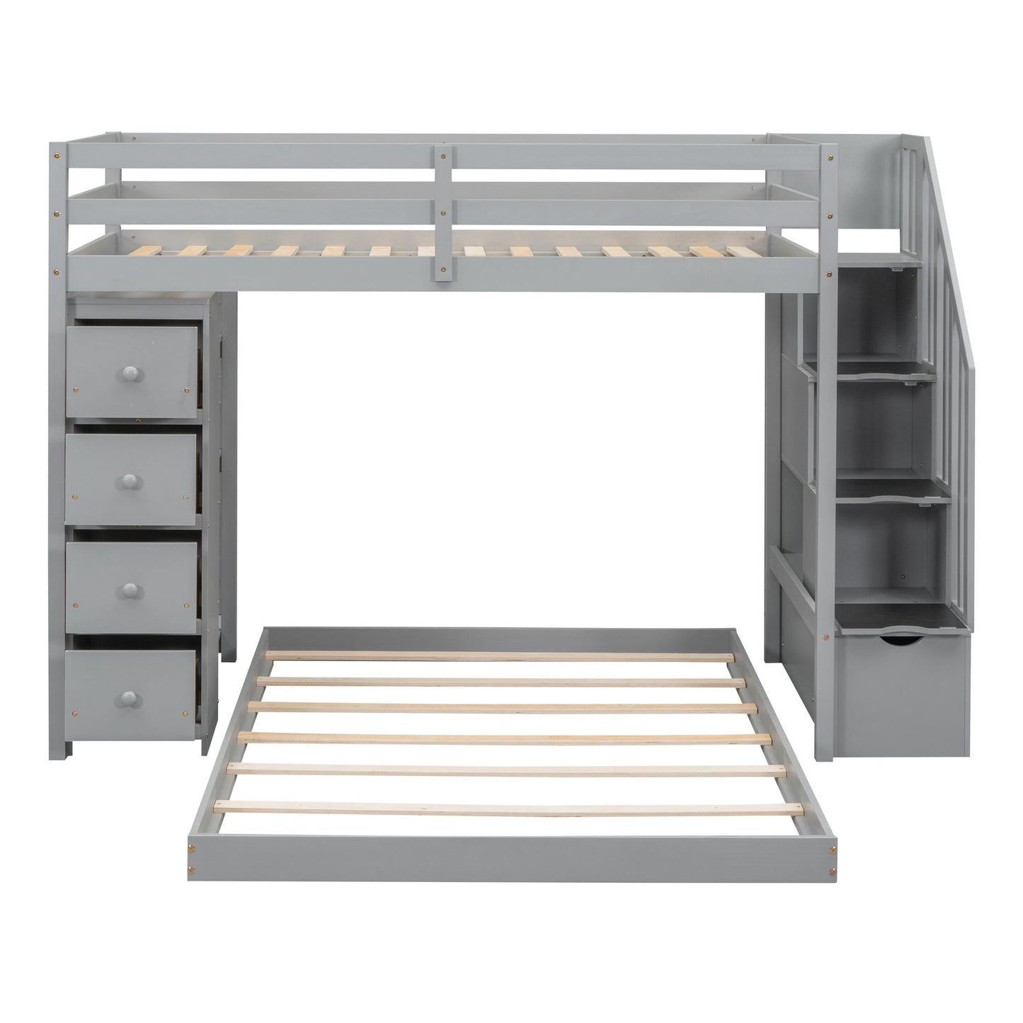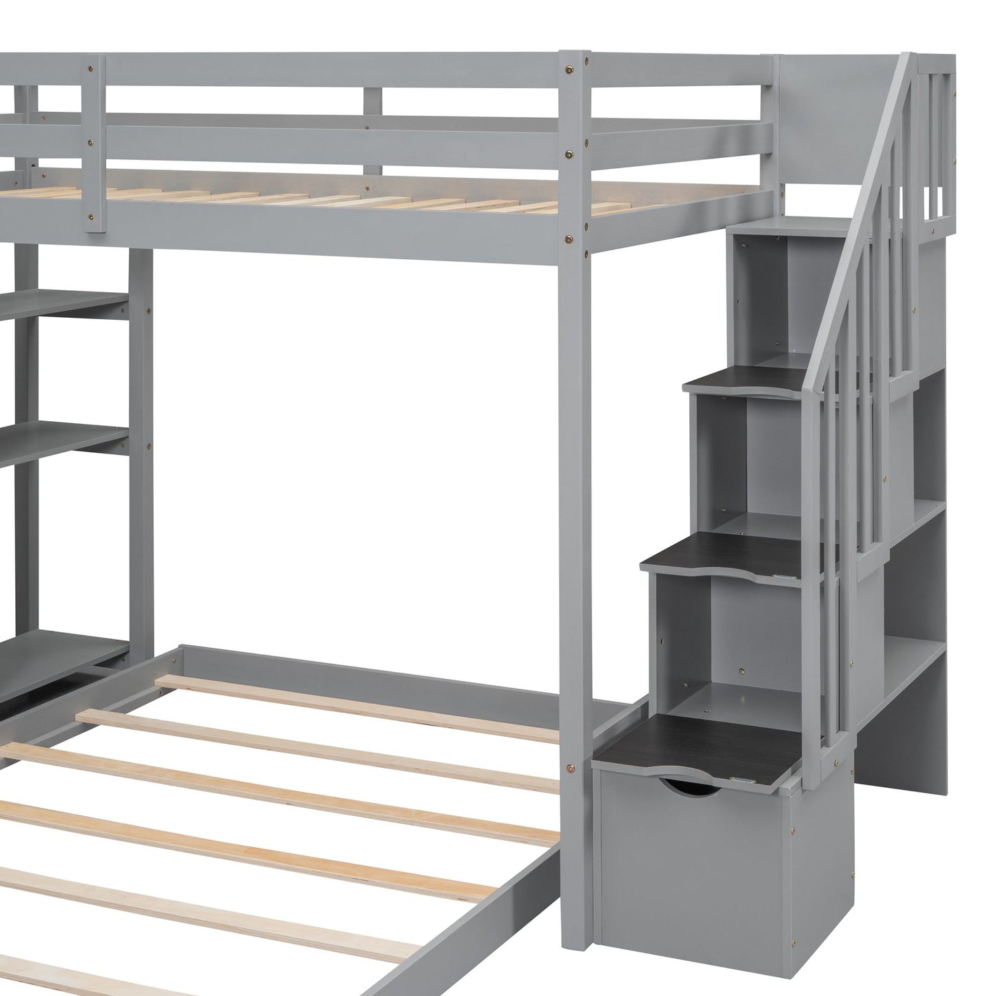Twin Over Full Bunk Bed with 3-layer Shelves, Drawers and Storage Stairs, Gray