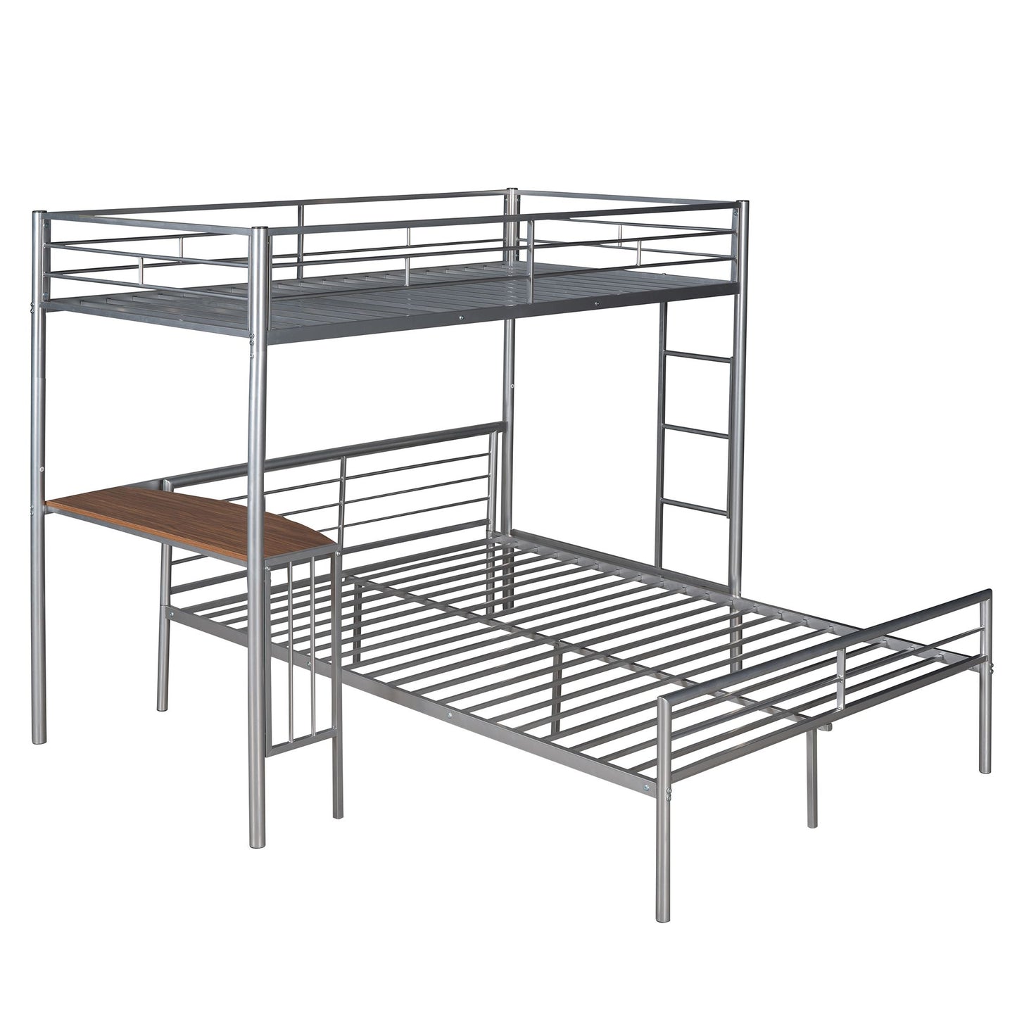 Twin Over Full Metal Bunk Bed with Desk, Ladder and Quality Slats for Bedroom, Metallic Silver