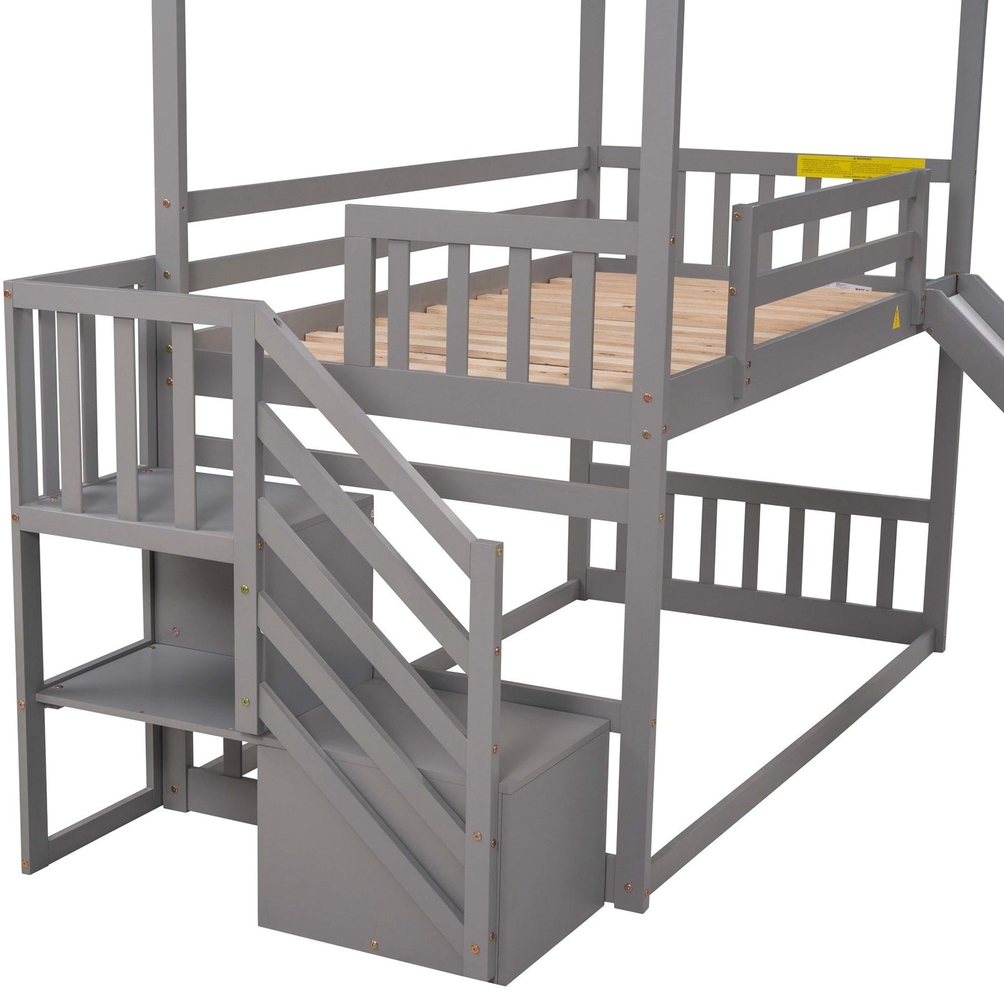 Twin over Twin House Bunk Bed with Convertible Slide, Storage Staircase can be Placed Left or Right, Gray