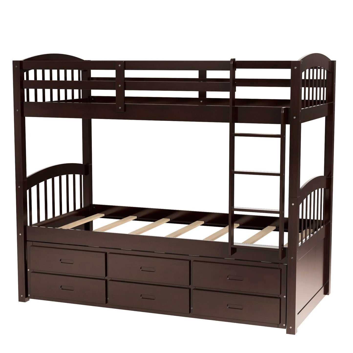 Twin over Twin Wood Bunk Bed with Trundle and Drawers,White