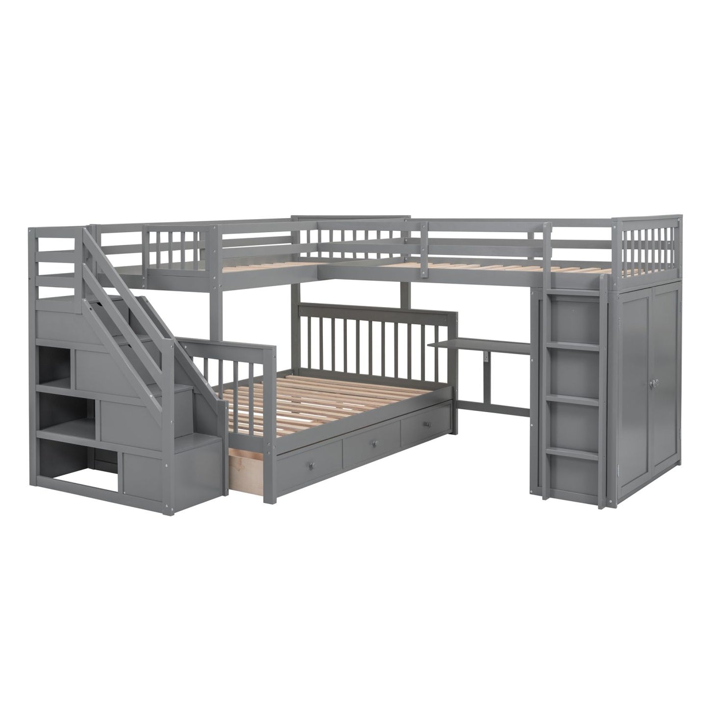 Twin-Twin over Full L-Shaped Bunk Bed With 3 Drawers, Portable Desk and Wardrobe, Gray